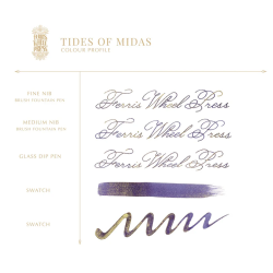 Découvrez Marées de Midas (Tides of Midas), une encre issue de la poétique collection Ferritales de Ferris Wheel Press. Inspirée de la légende du roi Midas, cette encre marie un violet profond à un somptueux éclat doré, rappelant la transformation mythique en or.